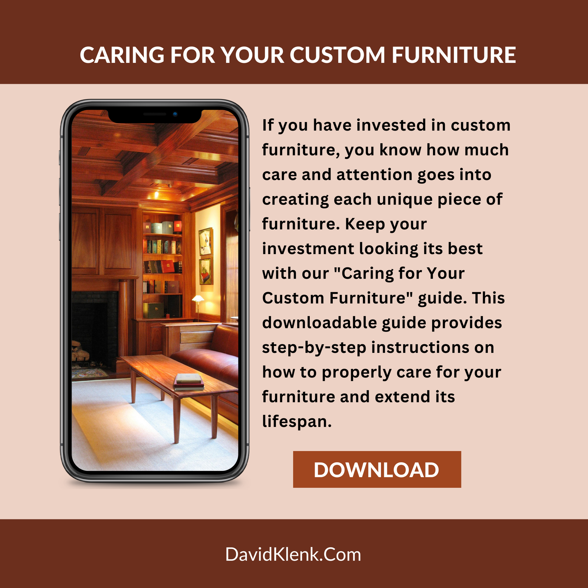 If you have invested in custom furniture, you know how much care and attention goes into creating your beautiful piece of furniture. Keep your investment looking its best with our "Caring for Your Custom Furniture" guide. This downloadable guide provides step-by-step instructions on how to properly care for your furniture and extend its lifespan.