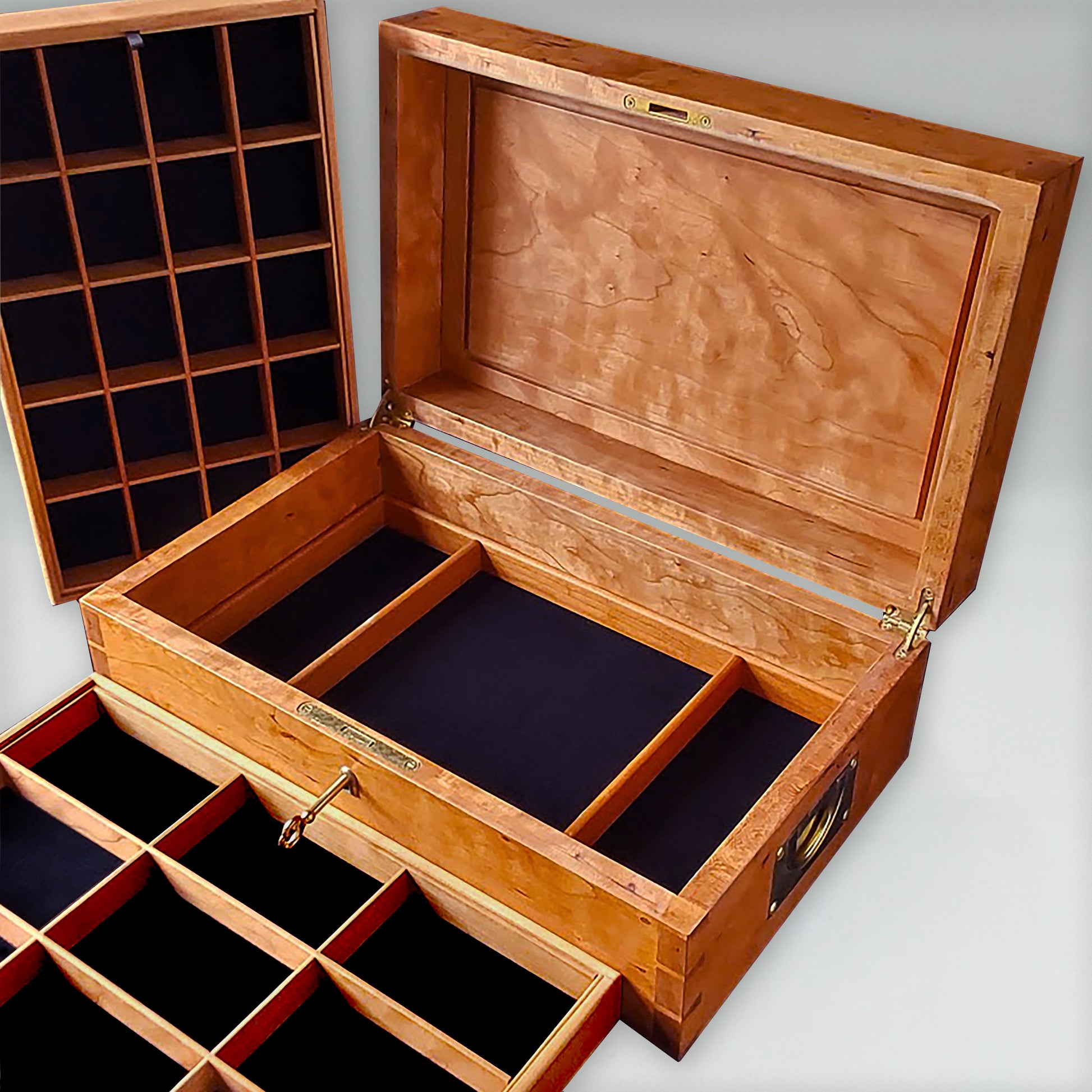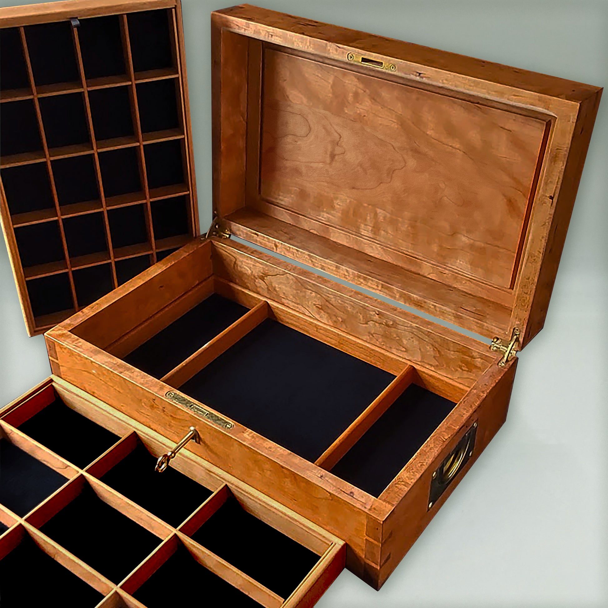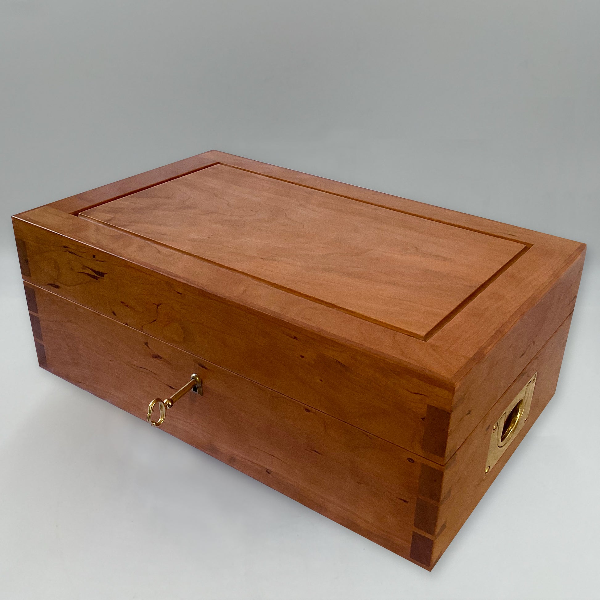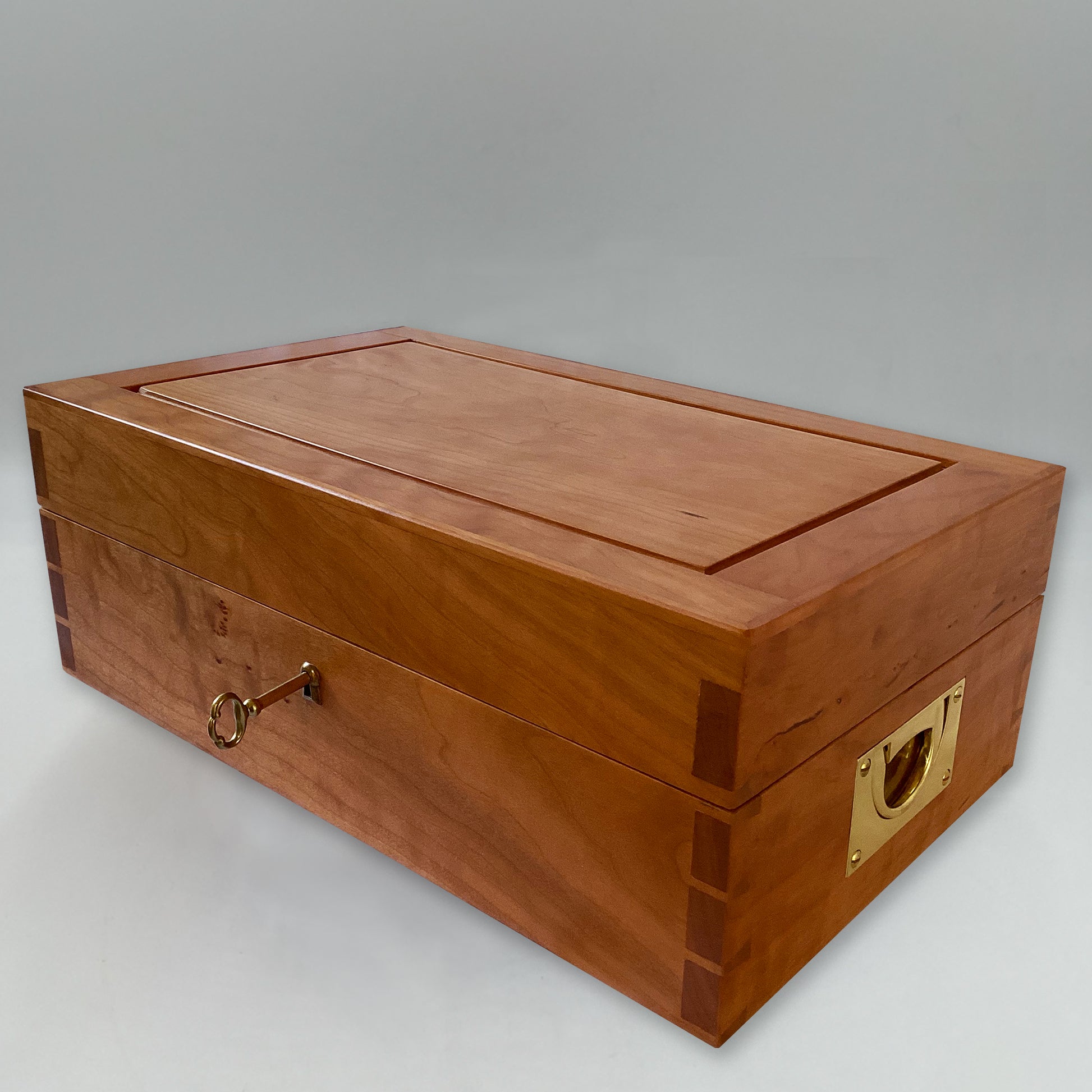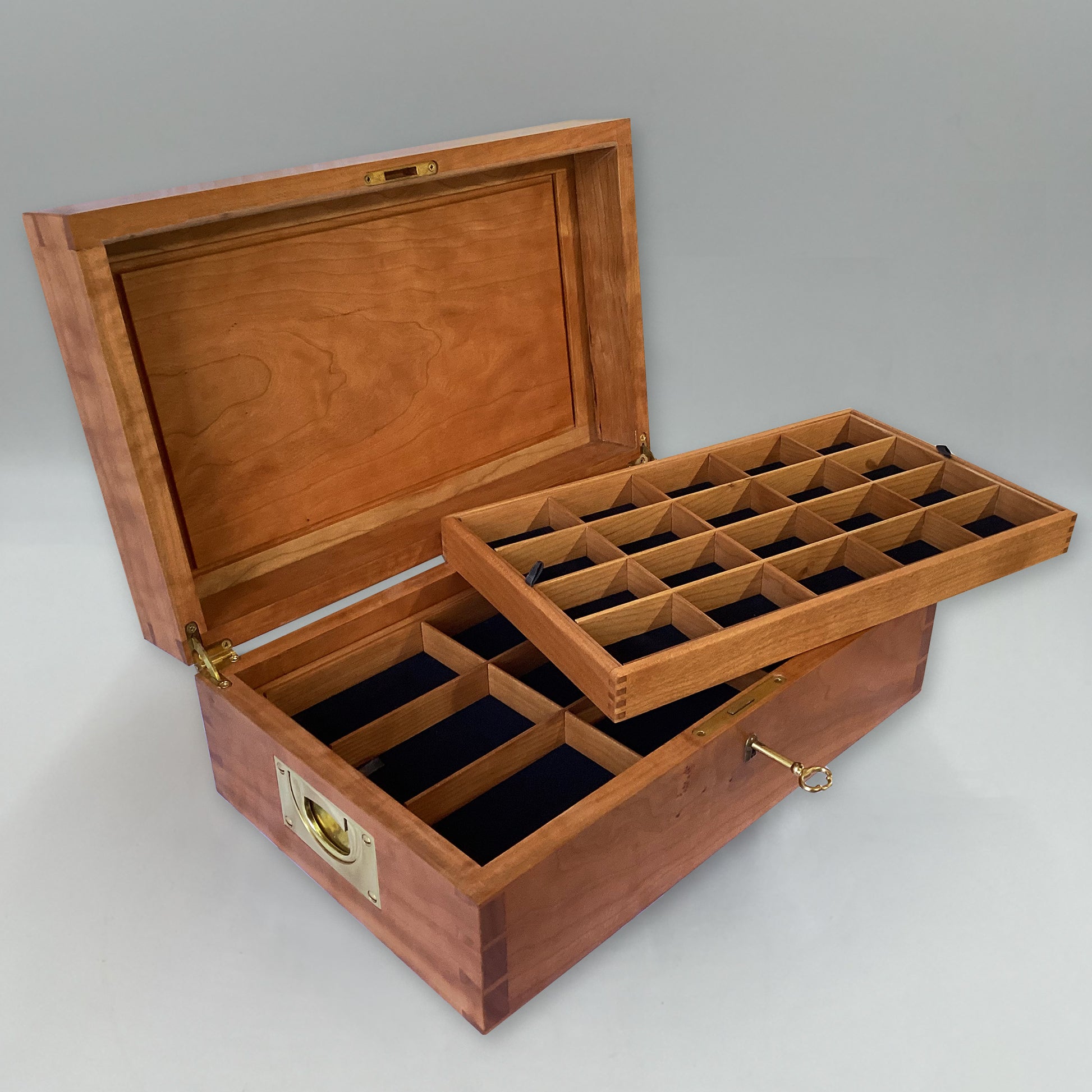 This is a great box for the jewelry collector. It is made from solid cherry wood. Special details include hand cut dovetails on the box's corners. Special details also include two removable trays. brass hardware, velvet liners, polished varnish finish, and a key lock. The box measures sixteen inches side to side, ten inches front to back and six inches tall.
